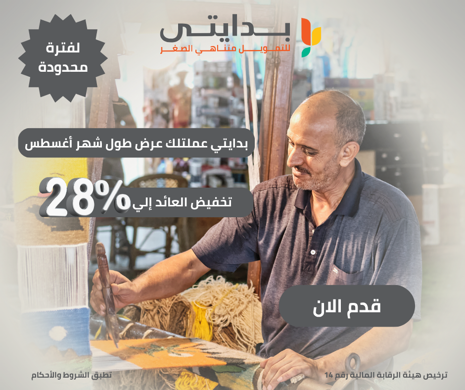 في إطار سعينا الدائم لدعم رواد الأعمال وأصحاب المشروعات متناهية الصغر، يسرنا في بدايتي للتمويل متناهي الصغر أن نعلن عن عرض خاص وحصري لعملائنا خلال شهر أغسطس فقط.