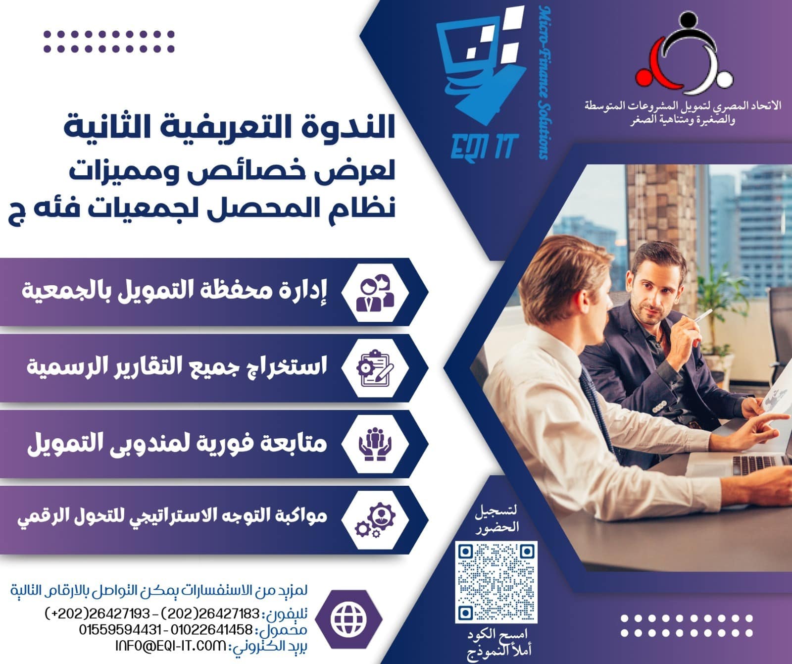 وذلك في إطار بروتوكول التعاون بين الاتحاد المصري لتمويل المشروعات المتوسطة والصغيرة ومتناهية الصغر-MSMEF وشركة EQI-IT لتوفير حلول تكنولوجية تناسب الجمعيات الأهلية من الفئة "ج" ذات المحافظ الائتمانية الأقل من 3 مليون جنيه.